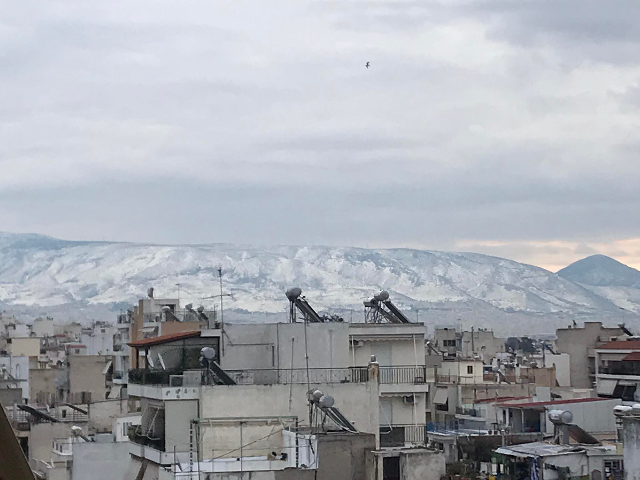 Από τον Πειραιά, που ευτυχώς δεν χιόνισε και όλα είναι καλά, βλέπουμε τον Υμηττό χιονισμένο και δίκαια. Το θέμα είναι, δυστυχώς, ότι οι μικροί δρόμοι, ακόμα και μέσα στην Αθήνα, είναι αδιάβατοι.