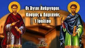 Την 1ην Ιουλίου εορτάζουν οι Άγιοι Ανάργυροι, Κοσμάς και Δαμιανός οι Ρωμαίοι, αδέλφια και ιατροί. Λέγονται Ανάργυροι, γιατί δεν έπαιρναν αργύρια (χρήματα).