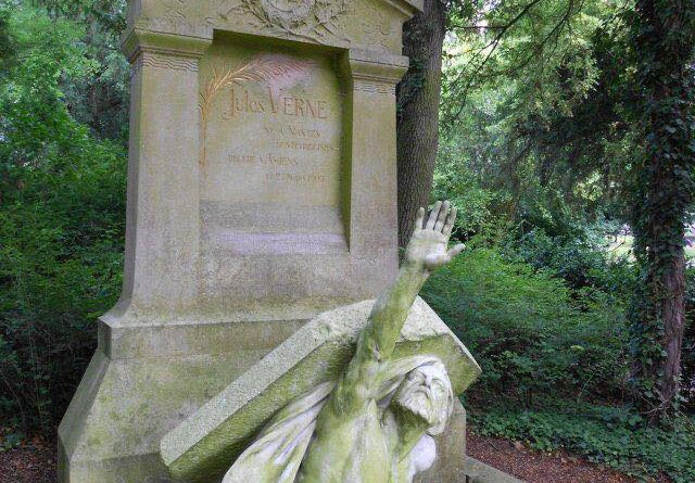 Ο αξιοσημείωτος τάφος του Ιουλίου Βερν βρίσκεται στο Cimetière de la Madeleine στην Αμιέν της Γαλλίας. Δημιουργήθηκε από τον γλύπτη Albert Roze, το εντυπωσιακό μνημείο -χρησιμοποίησε τη μάσκα θανάτου του Οράς Βερνέ- απεικονίζει τον θρυλικό συγγραφέα που αναδύεται από τον τάφο, φτάνοντας προς τον ουρανό.