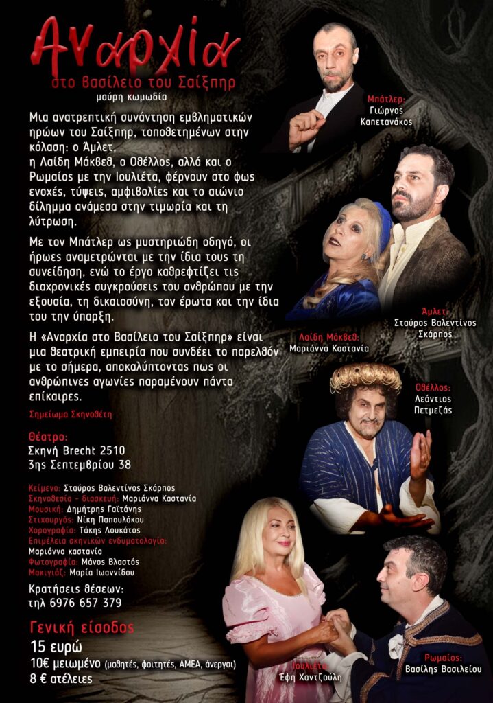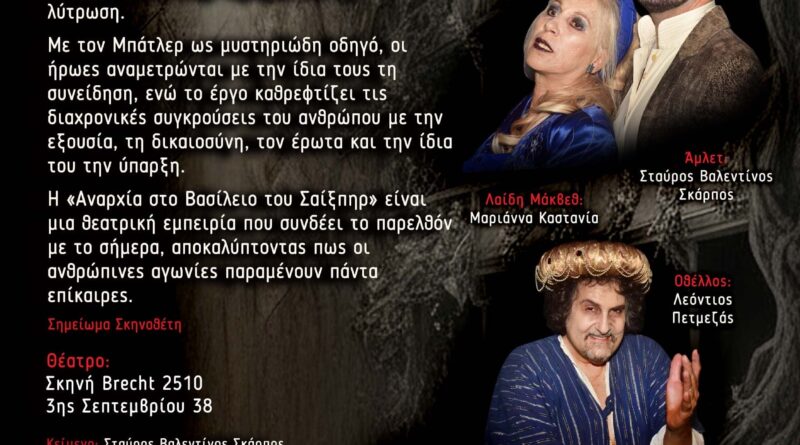 “Το έργο αυτό “Αναρχία στο Βασίλειο του Σαίξπηρ ” φέρνει μια εκπληκτική συνάντηση των πιο εμβληματικών χαρακτήρων της θεατρικής κλασικής παράδοσης