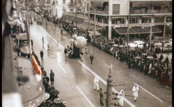 Παρέλαση Καρναβαλιού επί της λεωφόρου Βασ. Σοφίας, σημερινή Γρηγορίου Λαμπράκη, κατά την διάρκεια της επταετίας και επί δημαρχίας Αριστείδη Σκυλίτση. Αριστερά η επιγραφή του κινηματογράφου «Κάπιτολ» και δεξιά το καφεζαχαροπλαστείο Παπασπύρου στην συμβολή με την οδό Αγγέλου Μεταξά (Πασαρέλα).