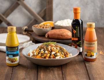 Σαλάτα με γλυκοπατάτες λευκά τυριά και καρύδια Υλικά: 1 κιλό γλυκοπατάτες, 100γρ πικάντικη φέτα, 60γρ ξινομυζήθρα, 3 κ.σ. χυμό πορτοκάλι,